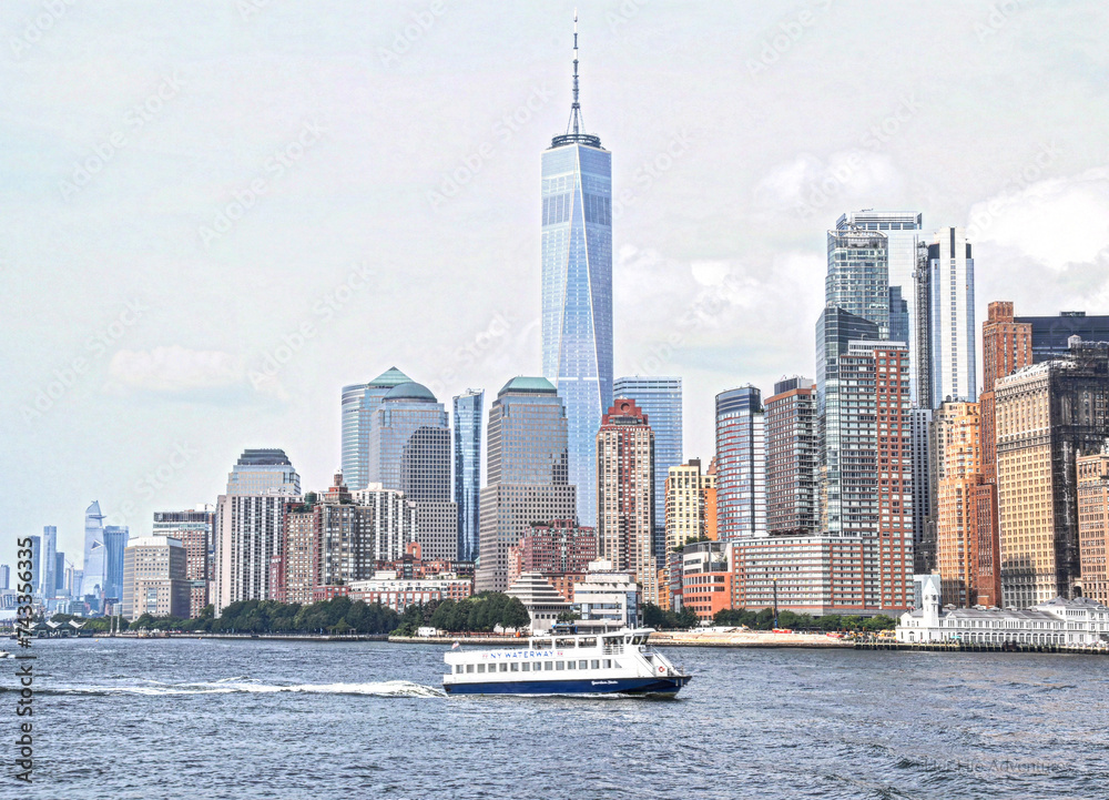 New York Skyline view from water during ferry ride over to Ellis Island.