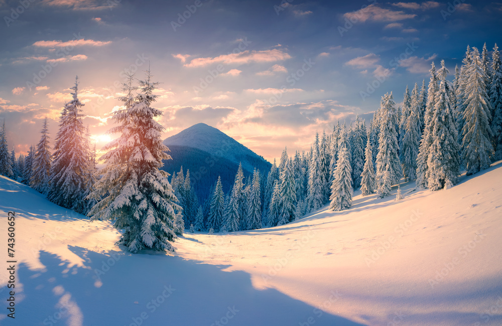 Beautiful winter sunrise with snow covered trees in the mountain