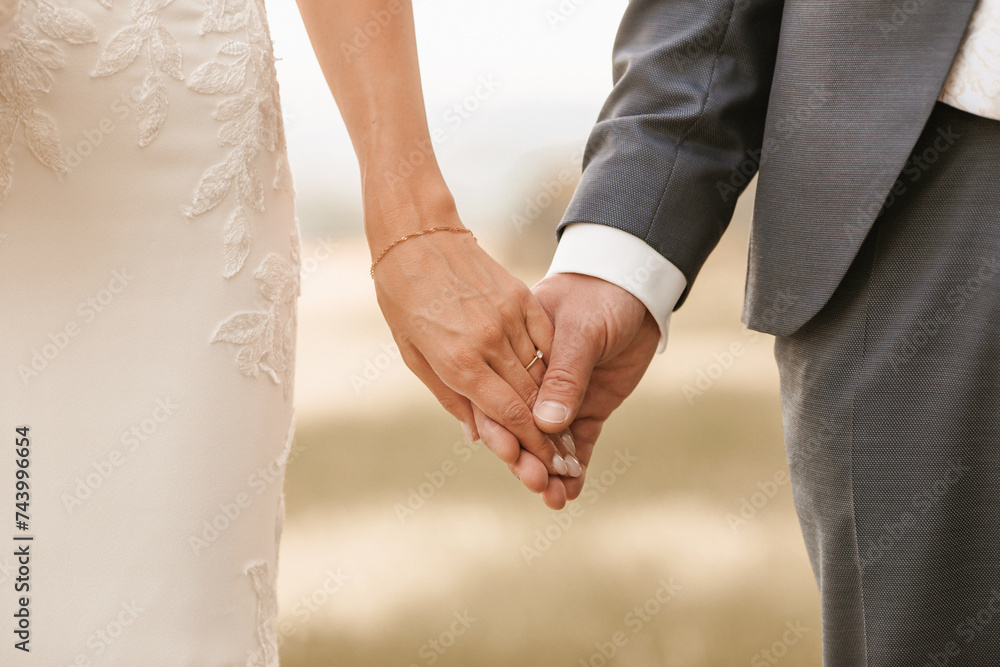 Close-up of bride and groom holding hands with wedding rings at reception outside in the backyard.