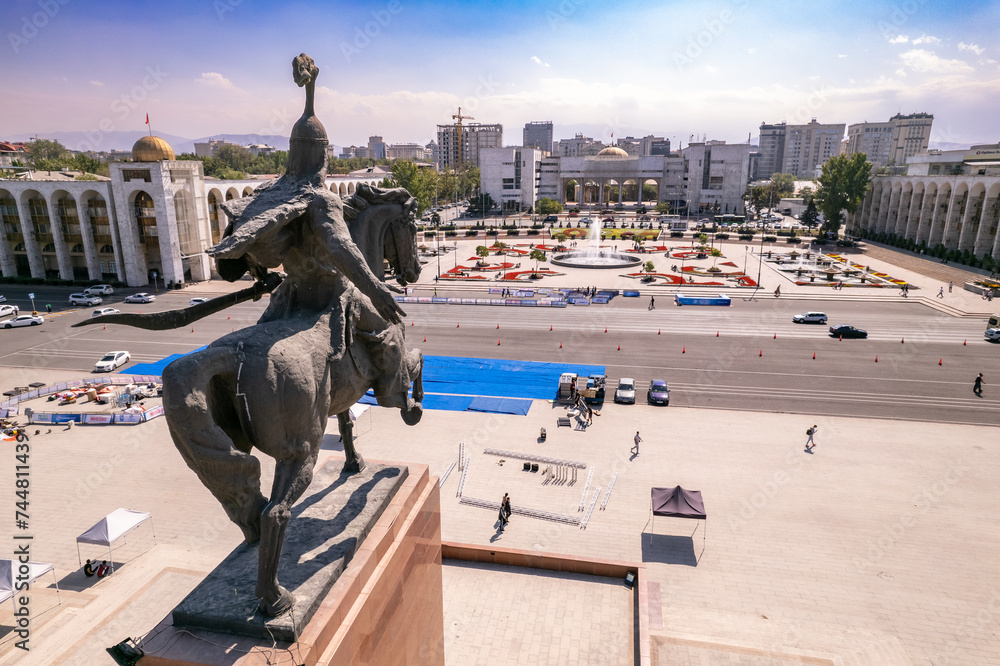 Aerial top view to Monument Epic Statue of Aykol Manas - kyrgyz hero on Ala-Too Square. State History Museum in downtown of Bishkek city. Central asia, Kyrgyzstan.