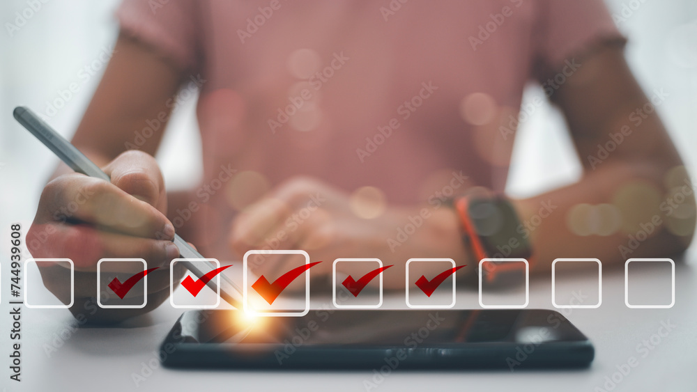 Checklist concept. Businesswoman using a laptop. Checking marks on checkboxes on the futuristic virtual interface screen.