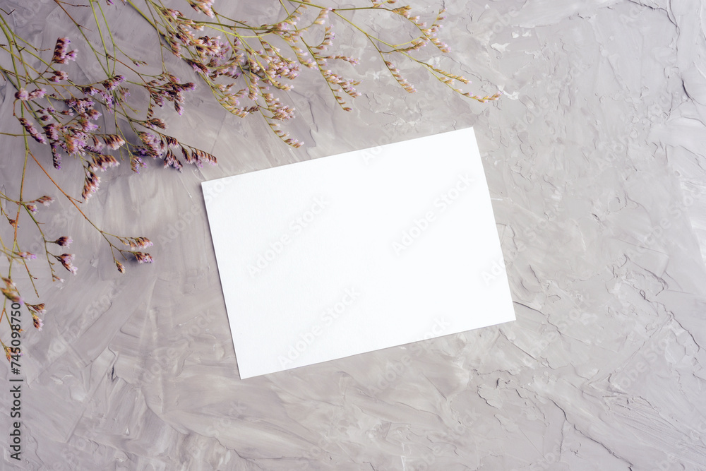 Blank card and kermek flowers on grey concrete background. Top view, flat lay, mockup