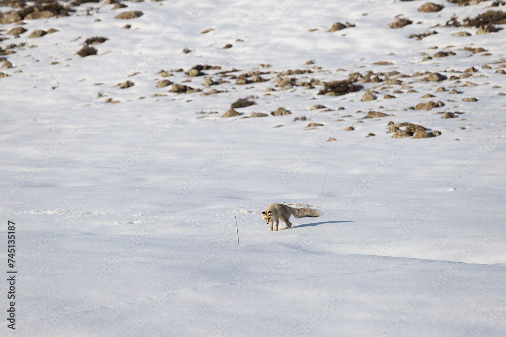 fox looking for food in the snow.