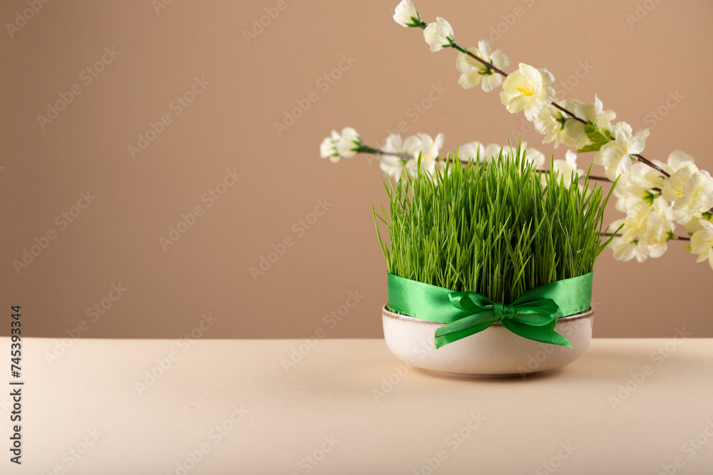 Traditional Novruz semeni wheat glass decorated with ribbon on neutral beige shebeke background and white blooming branch, celebration of spring equinox in Azerbaijan