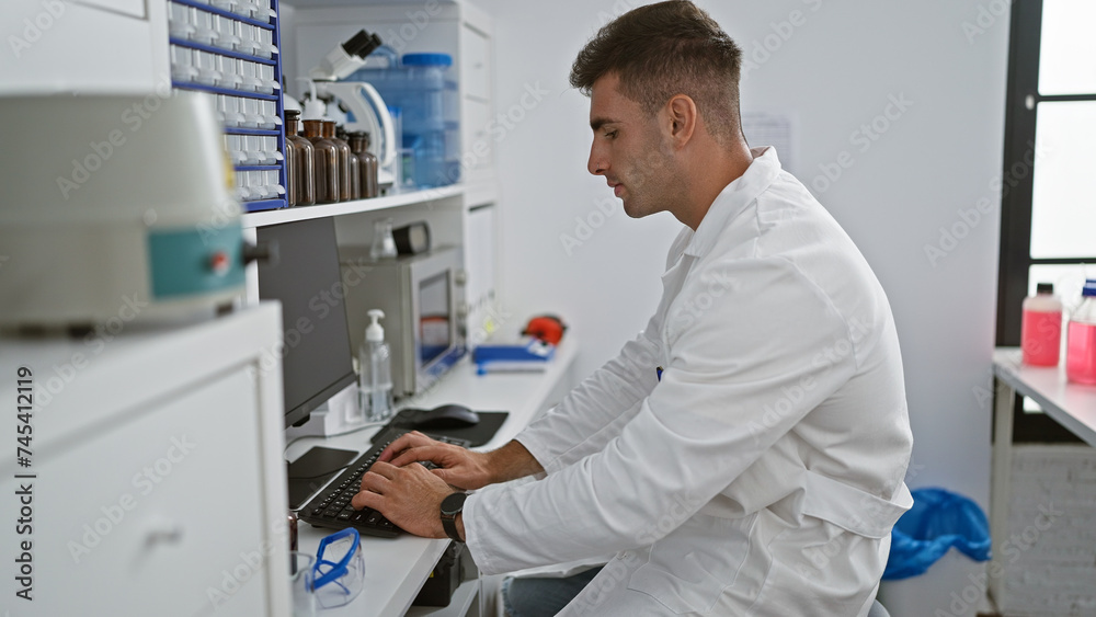 Young, handsome hispanic scientist engrossed in intensive medical research, using computer analysis in a professional lab environment