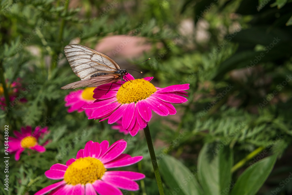 White hawthorn butterfly close-up on bright pink dolmata chamomile flower