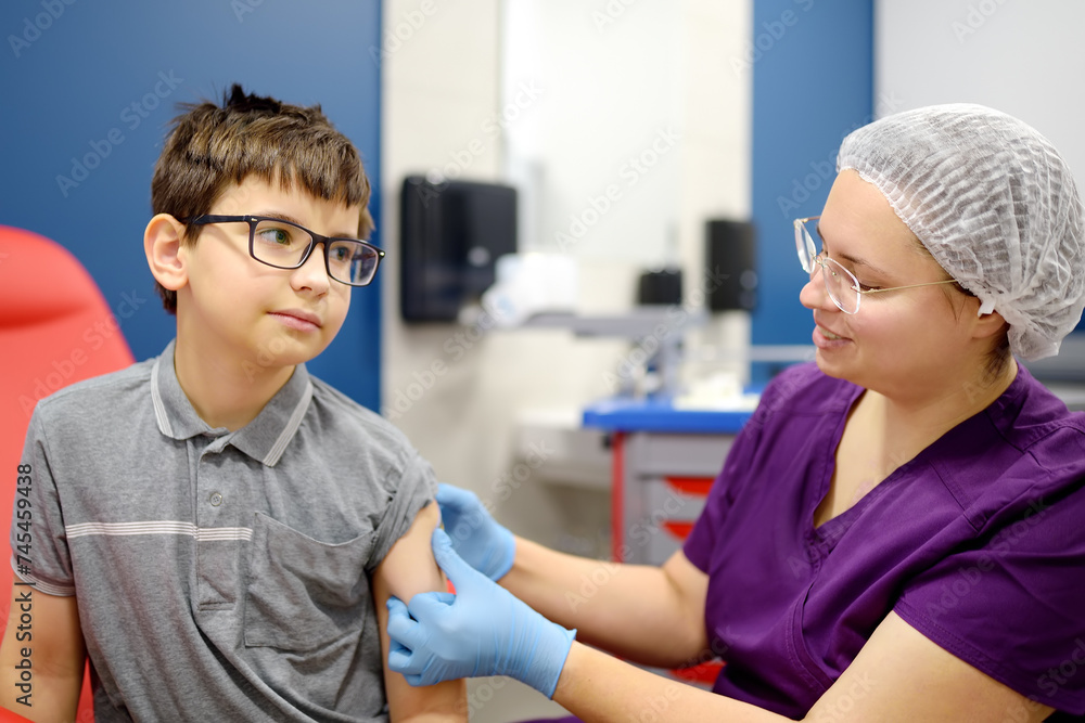 A little boy is being vaccinated. A child is very afraid of the injection. Schoolkid nervous during scheduled vaccination. Close up