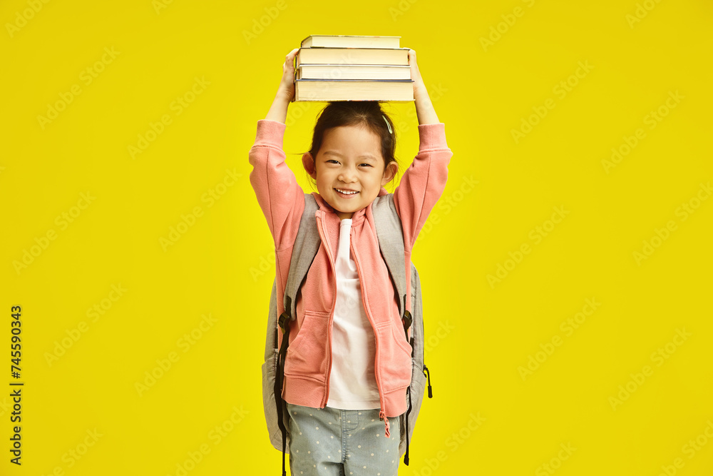 Cute chinese schoolgirl holding books on head over yellow isolated background. First grader kid girl preparing to the school.