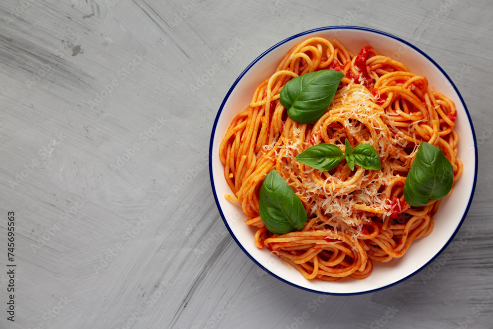 Homemade Pasta Pomodoro on a Plate, top view. Flat lay, overhead, from above. Copy space.