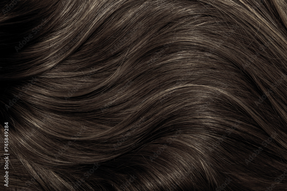 Brown hair close-up as a background. Women's long brown hair. Beautifully styled wavy shiny curls. Hair coloring. Hairdressing procedures, extension.