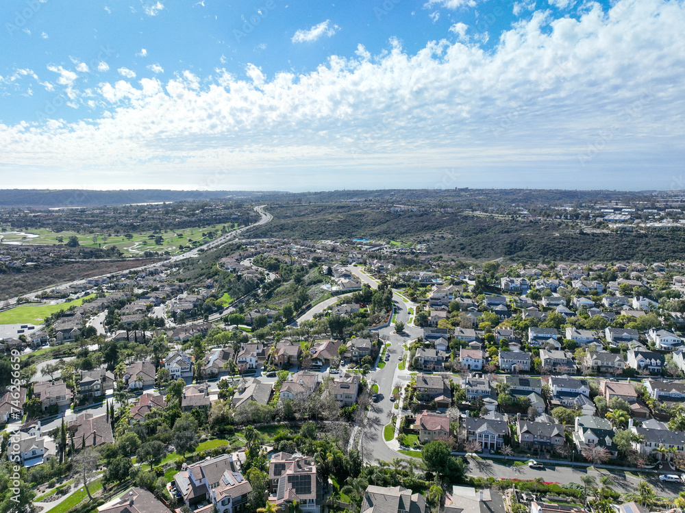 Aerial view of large-scale villa in wealthy residential town of Carlsbad, South California, USA. High quality 4k footage