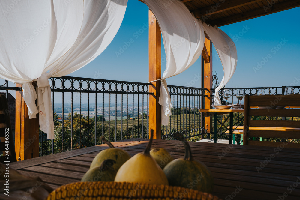 A serene and picturesque view from a rustic wooden balcony, beautifully set for an intimate alfresco dining experience. The scene overlooks a sprawling panoramic landscape under a clear blue sky, with