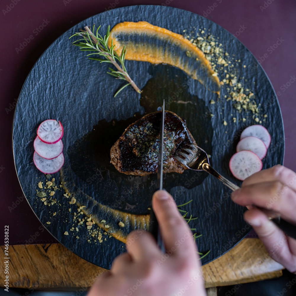 A perfectly seared steak on a slate plate, garnished with rosemary, puree swipe, and sliced radishes, with hands cutting into the juicy meat
