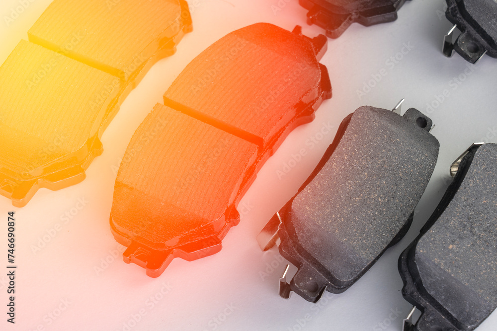 Brake pads for passenger car disc brakes, New brake pads for passenger car disc brakes. New spare parts for vehicle maintenance and repair
