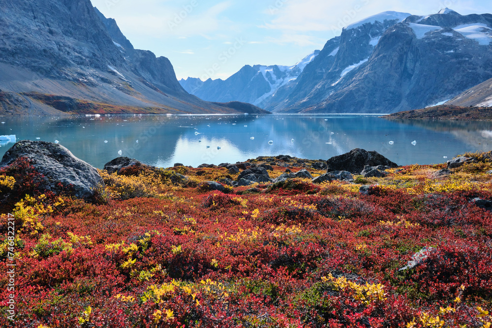 Skoldungen and fjord with autumn tundra vegetation. East Greenland.