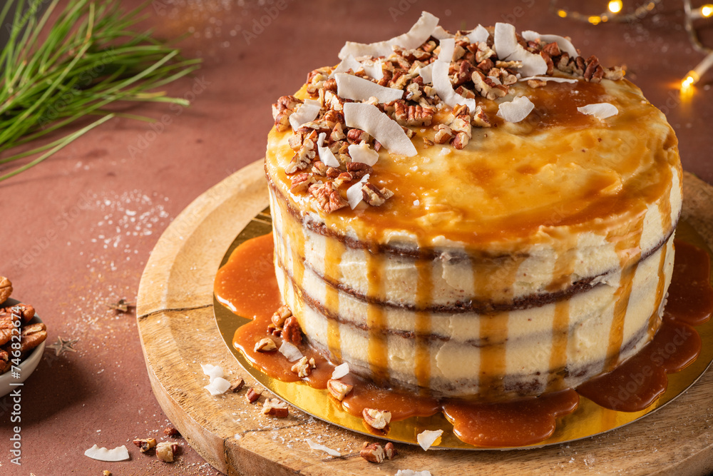 Delicious salted caramel cake with pecan nuts and coconut flakes