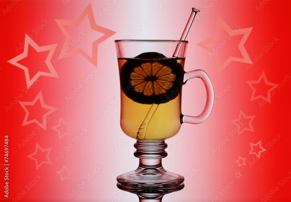Yellow mulled wine on red background with lemon