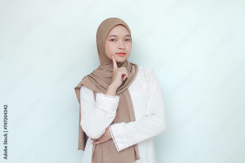 Young Asian Muslim woman wearing hijab, serious and see camera with pensive expression and thinking gesture. Isolated in gray background.