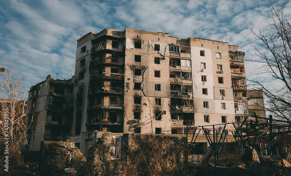 Russian invasion of Ukraine war torn city destroyed car burn out. Russia war damage building destruction city war ruins city damage car. Terror attack bomb shell of civilian bombed. Disaster area.