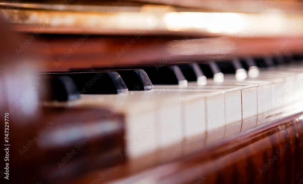 Piano keyboard background with selective focus. Warm colour toned image.The piano was set up in the music room by the windows in the morning to allow the pianist to rehearse before the classical piano