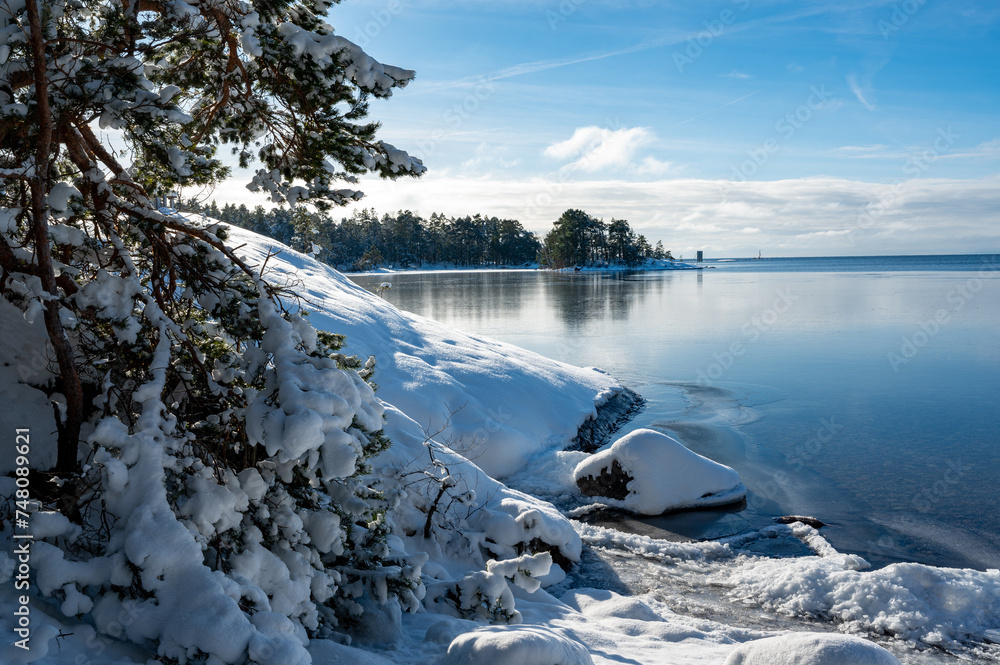 Looking through forest out on lake Vattern in February