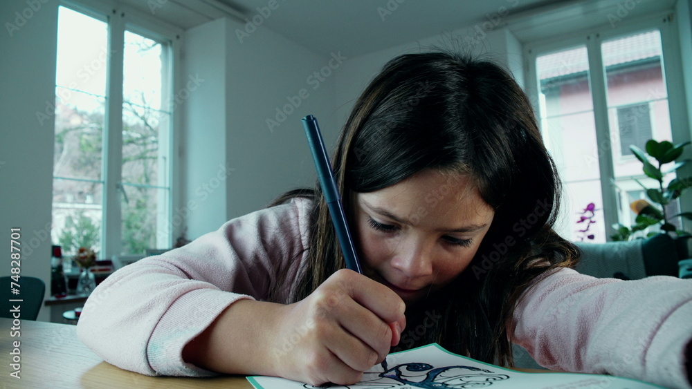 Focused Young Girl Drawing Creatively on Paper. A little girl deeply engaged in artistic play, using a pen to draw on paper while at home