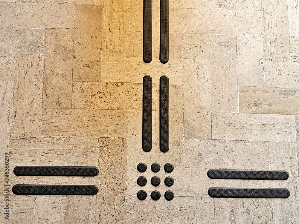 Path for blind or low vision with a textured podotactile surface, so that pedestrians can recognize an obstacle, exit or stairs using their feet or cane