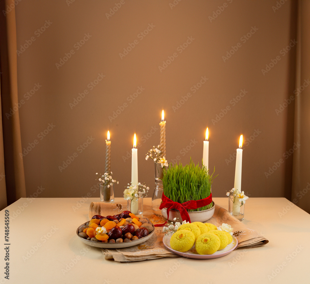 Beautiful Novruz setting on peachy neutral background with fresh semeni wheat glass with red ribbon, candles and traditional Azerbaijani pastry on the table, dried fruits and eggs and daffodils