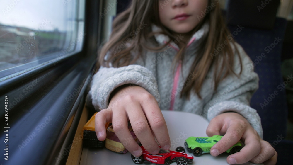 Little Girl Playing with Car Toys on Train, 8 year old kid Engaged in Play by Window while commuting