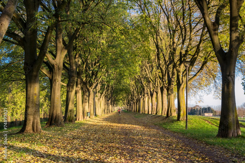 The Walls of Ferrara during autumn with fallen leaves on the gro