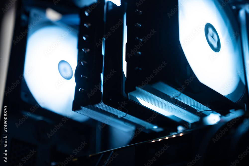 Detail of the interior of the PC gamer case. Motherboard, CPU tower cooling, memory, graphic card and RGB fans. professional gaming computer. Gaming PC with RGB LED lights hardware.