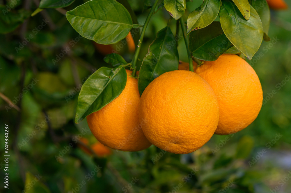 Close-up of ripe oranges hanging on a tree in an orange plantation garden 1