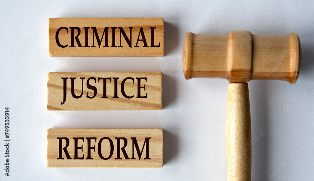 CRIMINAL JUSTICE REFORM - words on wooden blocks on a white background with a judge's gavel.