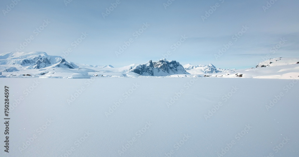 Winter Antarctica snow covered nature landscape. Frozen ocean, mountain range in background, sunny weather, blue sky. Desert white land of ice. Polar arctic travel scene. Low angle drone flight