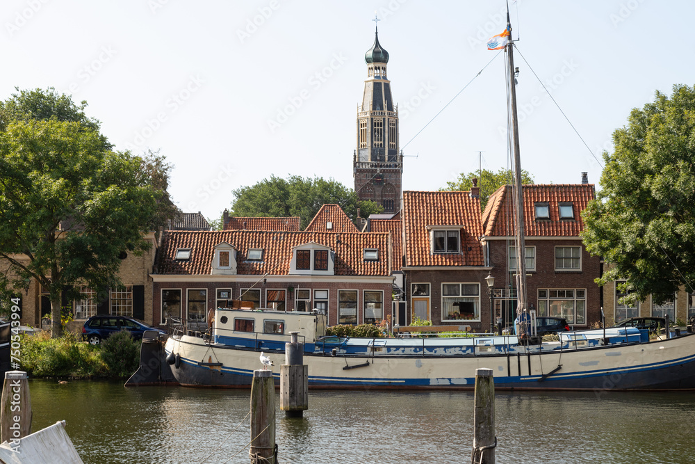 Cityscape of the picturesque town of Enkhuizen with the church tower of the Zuiderkerk in the background.