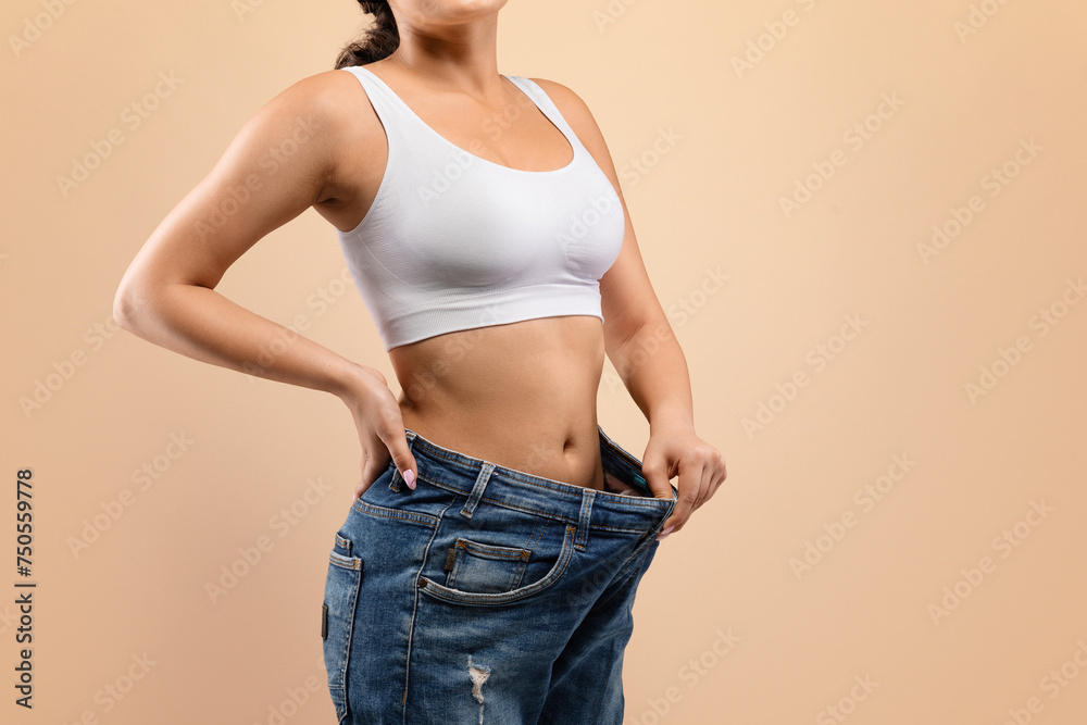 Fit woman confidently demonstrating successful weight loss by pulling out oversized jeans,