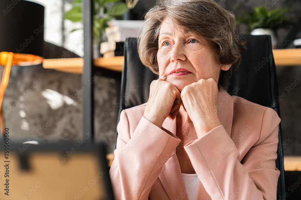 Frustrated sad depressed caucasian senior businesswoman ceo thinking about report, being fired, resigned, having health issues problems, suffering from chronic overworking in office, having nostalgy
