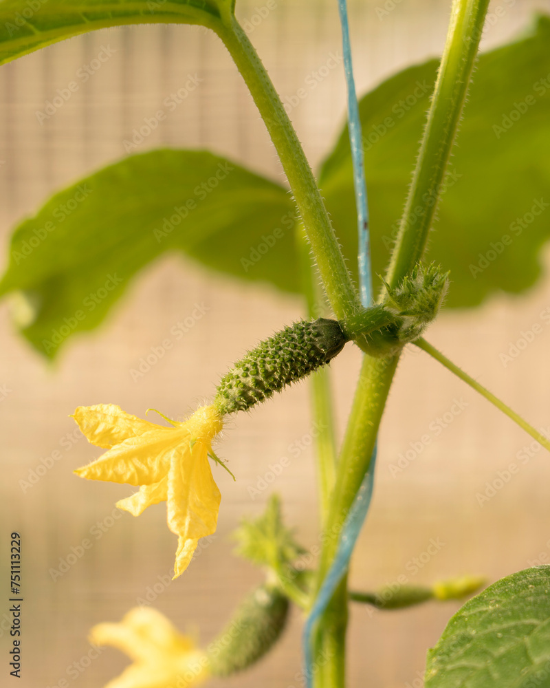 Cucumber seedlings, young green plants in the greenhouse begin to bloom