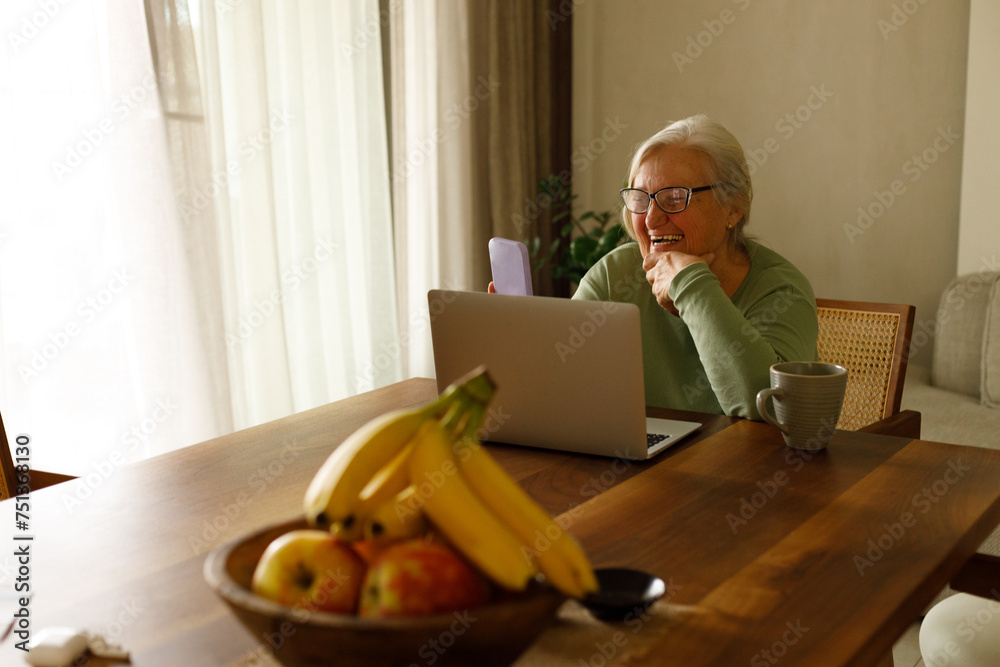 Senior woman video calling on smartphone at home