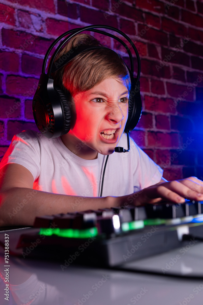 A child plays video games in front of a keyboard. A gamer boy plays computer games against a neon lit brick wall.