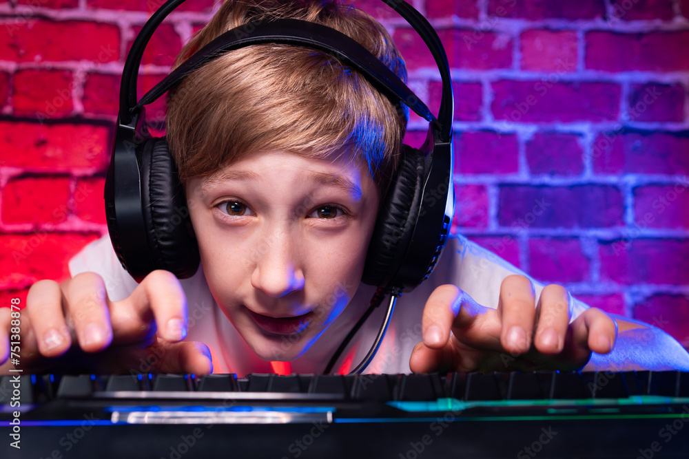 A teenager at a keyboard making faces playing computer games. A gamer boy plays computer games against a neon lit brick wall.