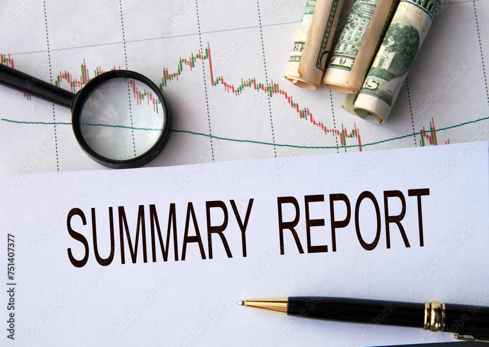 SUMMARY REPORT - words on a white sheet against the background of a chart, magnifying glass and banknotes