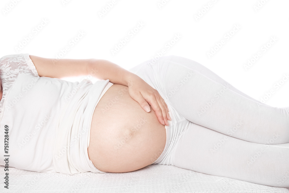 Happy pregnant girl lies on white background