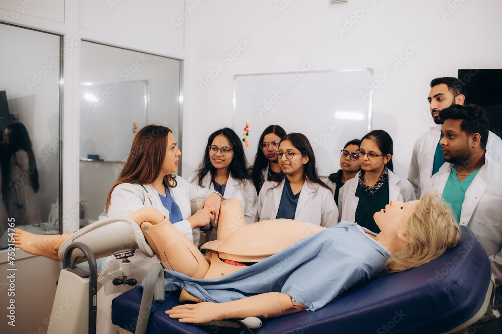 A group of medical students learn obstetrics by performing practical tasks on a mannequin
