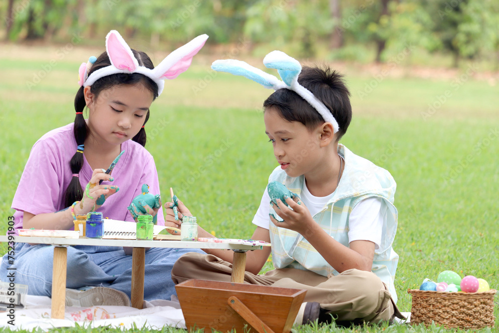 Cute Asian boy and girl with bunny ears painting egg with paintbrush while sitting together on green grass meadow in garden. Kids celebrating Easter holiday outdoor. Happy children in park on Easter