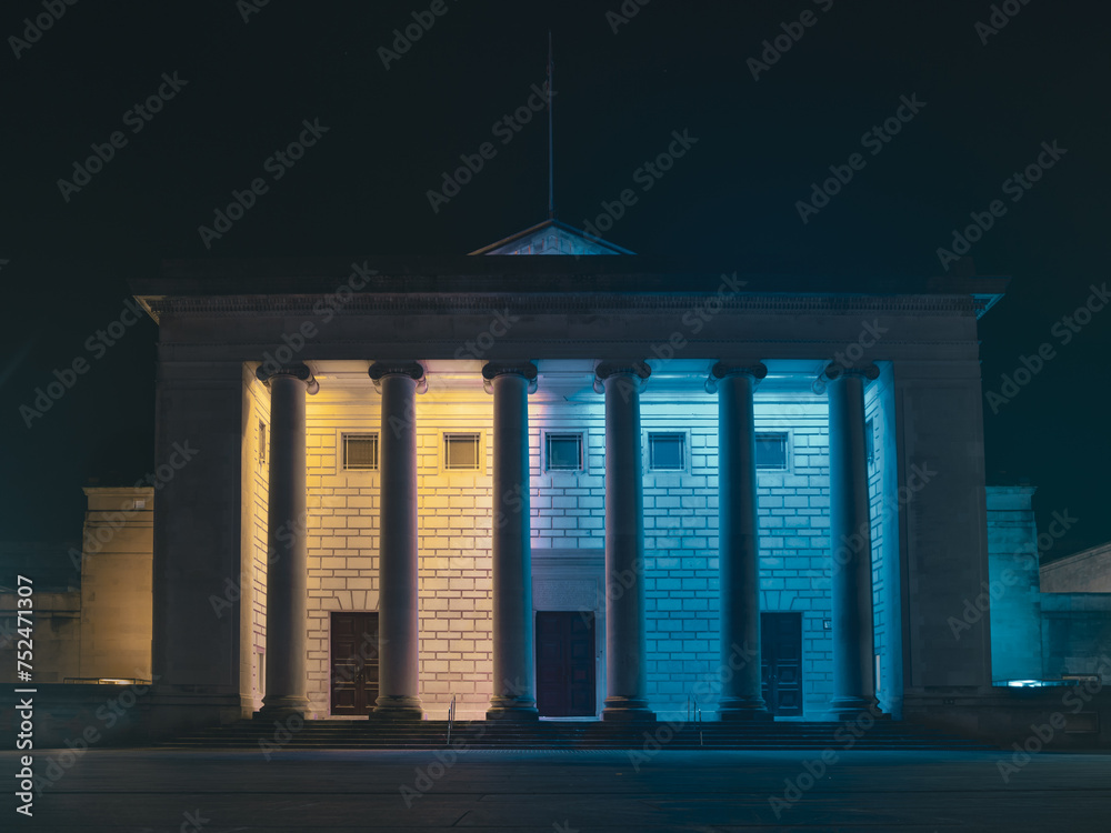 Front view of the Guild Hall in city of Southampton with Ukraine flag colors at night