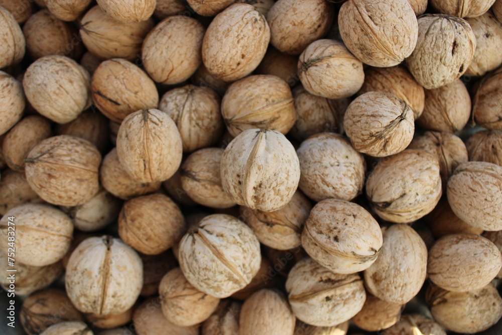 shelled walnuts. Pile of unshelled walnuts in daylight. walnut background.