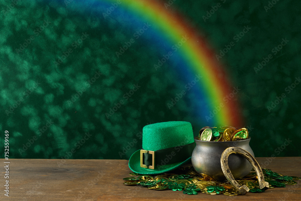 Saint Patrick's Day background. Black pot full of gold coins and leprechaun hat