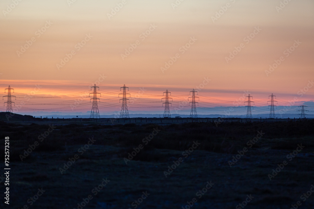 Pylons illuminated by sunset, Image shows a beautiful sunset with the sky light up with various colours and a silhouette of a row of pylons heading towards UK towns