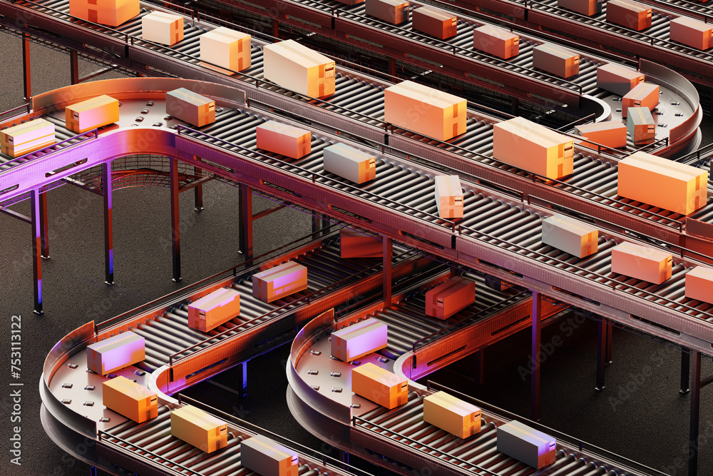 Cardboard boxes go on conveyor. Automated production line. Conveyor in industrial building. Fulfillment warehouse. 3d image.